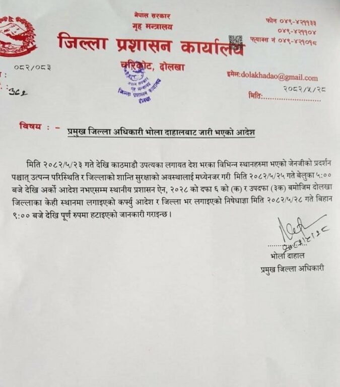 जिल्ला प्रशासन कार्यालय, दोलखाले जिल्लामा लागू गरिएको कर्फ्यु र निषेधाज्ञा पूर्ण रूपमा हटाएको छ। प्रशासनका अनुसार, आज बिहान ९ बजेदेखि उक्त आदेश हटाइएको हो। जेनजी आन्दोलनका क्रममा देशभरका स्थानहरूमा प्रदर्शनका कारण उत्पन्न सुरक्षा चुनौतीलाई मध्यनजर गर्दै कर्फ्यु र निषेधाज्ञा लगाइएको थियो।
