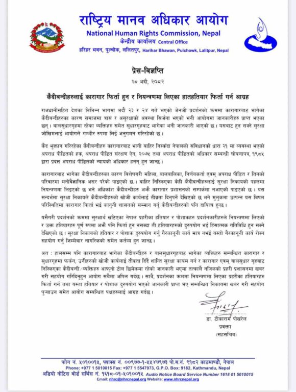 राष्ट्रिय मानव अधिकार आयोगले भदौ २३ र २४ गतेका जेनजी प्रदर्शनका क्रममा कारागार र बालसुधारगृहबाट भागेका कैदीबन्दी तथा व्यक्तिहरुलाई कारागारमा फर्कन आग्रह गरेको छ। आयोगले उनीहरु बाहिर रहँदा समाजमा त्रास र असुरक्षाको वातावरण सिर्जना भएको भन्दै सुरक्षामा रहेका महिलामाथि, बालबालिकामाथि, अपराध पीडित तथा उनका परिवारमाथि मनोवैज्ञानिक असर परेको जनाएको छ।