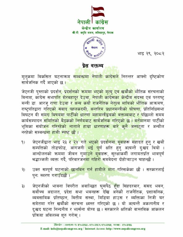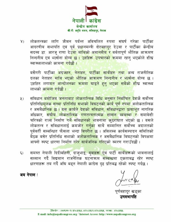 त्यसैगरी पार्टी सभापति शेरबहादुर देउवा र केन्द्रीय सदस्य डा.आरजु राणा देउवा माथि भएको भौतिक आक्रमणलाई कांग्रेसले निन्दा गर्दै शीघ्र स्वास्थ्य लाभको कामना गरेको छ।