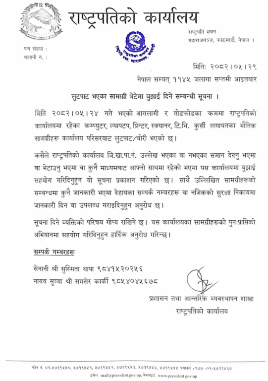 जेनजी प्रदर्शनका क्रममा तोडफोड र आगलागीबाट राष्ट्रपतिको कार्यालयबाट चोरी भएका कम्प्युटर, ल्यापटप, प्रिन्टर, टिभी, कुर्सी लगायतका सामग्री बुझाइदिन कार्यालयले आइतबार सूचना जारी गरेको छ ।