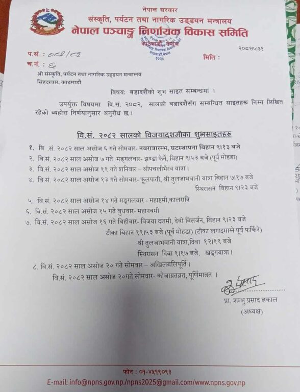 संस्कृति, पर्यटन तथा नागरिक उड्डयन मन्त्रालयले वि.सं.२०८२ सालको बडादशैंसँग सम्बन्धित शुभसाइत सार्वजनिक गरेको छ । मन्त्रालयले जनाएको अनुसार असोज ६ गते घटस्थापनाबाट प्रारम्भ हुने यस वर्षको दशैंमा असोज १६ गते बिहीवार बिहान ९:२३ बजे विजया दशमीको साइत परेको छ ।