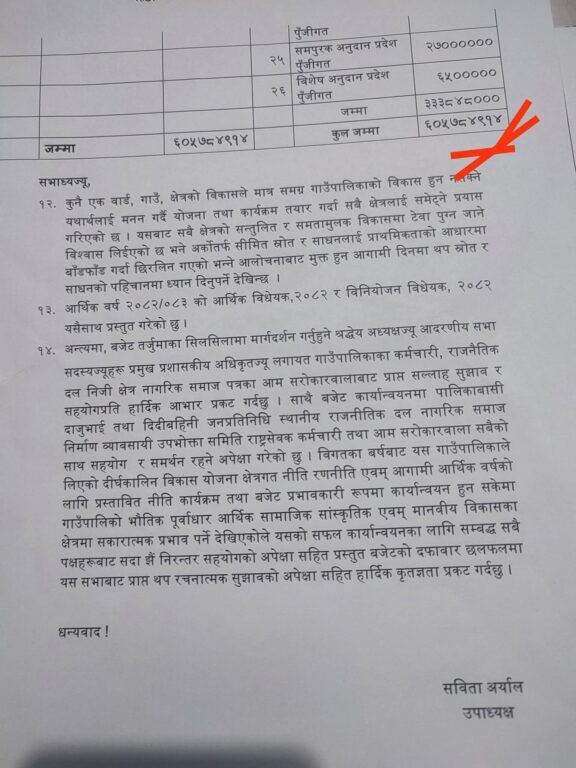 गाउँसभाबाट पारित भएको भन्दा ७ करोड बढी वजेट रातो कितावमा समावेश हुँदा गाउँपालिका अध्यक्षले कुनै जानकारी नदिएको कार्यपालिका सदस्य भगवती अर्यालको भनाई छ ।