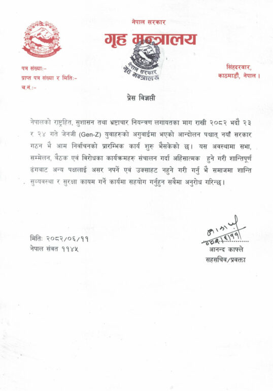 भदौ २३ र २४ गते जेनजी युवाहरूको अगुवाइमा भएको आन्दोलनपछिको नयाँ राजनीतिक परिदृश्यमा समाजमा शान्ति, सुव्यवस्था र सुरक्षा कायम गर्न सहकार्य गर्न मन्त्रालयले सबैलाई अनुरोध गरेको छ।