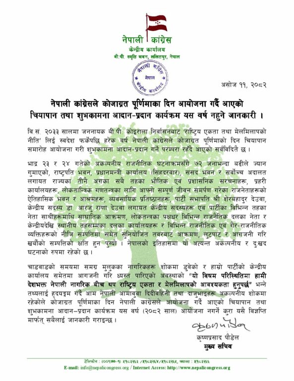 नेपाली काँग्रेसले हरेक वर्ष कोजाग्रत पूर्णिमाको अवसरमा आयोजना गर्दै आएको परम्परागत चियापान तथा शुभकामना आदान–प्रदान कार्यक्रम यस वर्ष नगर्ने निर्णय गरेको छ।