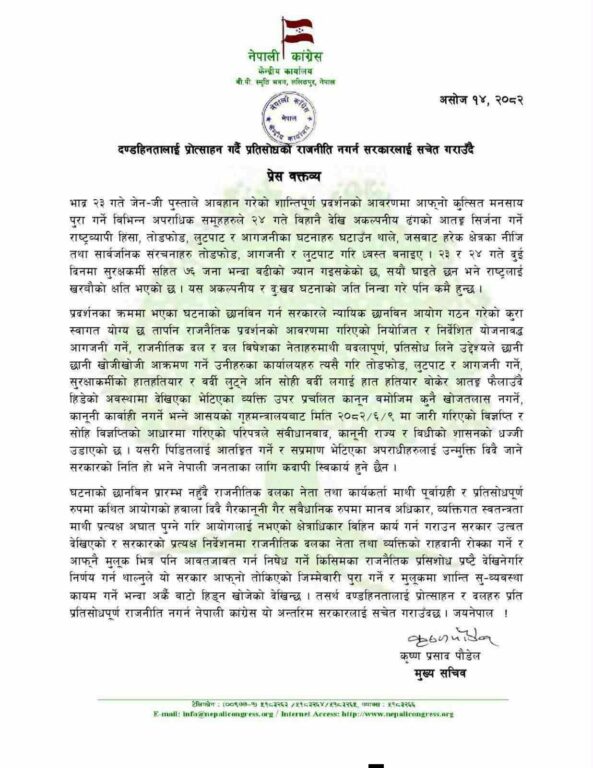 नेपाली कांग्रेसले भदौ २३–२४ गते भएको हिंसा, लुटपाट, तोडफोड र आगजनीका घटनामा संलग्नलाई उन्मुक्ति दिन खोजिएको भन्दै सरकारलाई कडा चेतावनी दिएको छ।
