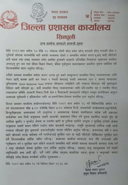 असोज १७ देखि २० गतेसम्म कोशी, मधेश, वागमती, गण्डकी र लुम्बिनी प्रदेशमा मध्यमदेखि भारी वर्षाको सम्भावना रहेकोले जिल्ला प्रशासन कार्यालय सिन्धुलीले उच्च सतर्कता अपनाउन सर्वसाधारणलाई अनुरोध गरेको छ।