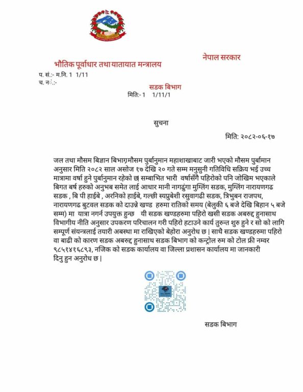 जल तथा मौसम विज्ञान विभागले असोज १७ देखि २० गतेसम्म देशभर मनसुन सक्रिय भई अत्यधिक वर्षा हुने पूर्वानुमान जारी गरेपछि सडक विभागले पहिरोको उच्च जोखिम रहेका सडकखण्डहरूमा रातिको समयमा यात्रा नगर्न आग्रह गरेको छ।