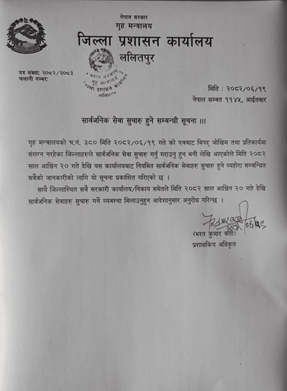 गृह मन्त्रालयको निर्देशनअनुसार विपद् जोखिम प्रतिकार्यमा प्रत्यक्ष संलग्न नभएका जिल्लाहरूमा सेवा सुचारु गर्न भनिएको थियो। त्यसअनुसार अब राजधानीका सबै सरकारी सेवा पुनः सञ्चालनमा आएका छन्।