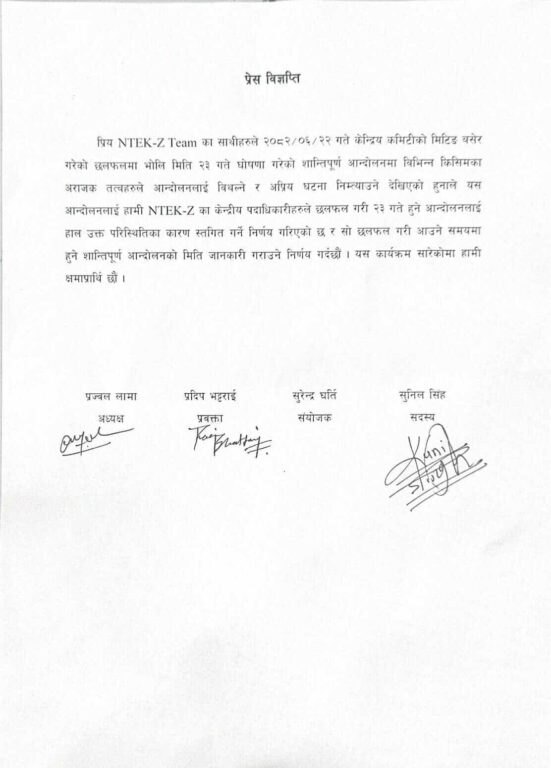‘ केन्द्रिय कमिटीको मिटिङ बसेर गरेको छलफलमा भोलि मिति २३ गते घोषणा गरेको शान्तिपूर्ण आन्दोलनमा विभिन्न किसिमका अराजक तत्वहरुले आन्दोलनलाई विथल्ने र अप्रिय घटना निम्त्याउने देखिएको हुनाले यस आन्दोलनलाई हामी NTEK – Z का केन्द्रीय पदाधिकारीहरुले छलफल गरी २३ गते हुने आन्दोलनलाई हाल उक्त परिस्थितिका कारण स्तगित गर्ने निर्णय गरिएको छ’ जारी विज्ञप्तिमा उल्लेख छ ।