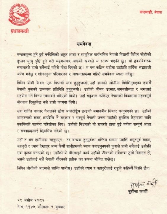 बन्धक हुनुपूर्वका अन्तिम क्षणमा विपिनको अभूतपूर्व साहस, बहादुरी र त्याग देखाएर कैयौं साथीहरूको ज्यान बचाएकोप्रति प्रधानमन्त्री कार्कीले कृतज्ञता प्रकट गरेकी छन् ।