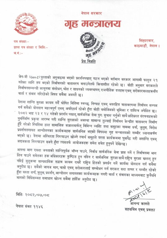 मन्त्रालयले शुक्रबार जारी गरेको विज्ञप्तिमा भनिएको छ ‘जेन–जी पुस्ताको अगुवाइमा भएको आन्दोलनपछि गठन भएको वर्तमान सरकार आगामी फागुन २१ गतेका लागि तय गरिएको निर्वाचनको तयारीमा केन्द्रित रहेको छ। निर्वाचनसम्बन्धी कानुनमा संशोधन, श्रोत र साधनको व्यवस्थापन तथा राजनीतिक दल र सरोकारवालासँग संवाद र समन्वय जारी रहेको पनि मन्त्रालयले जनाएको छ।