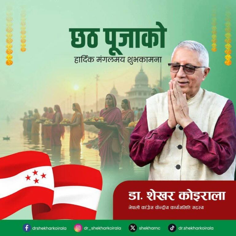 नेपाली कांग्रेसका नेता डा. शेखर कोइरालाले छठ पर्वको अवसरमा समस्त नेपाली दिदीबहिनी तथादाजुभाइहरूमा हार्दिक मंगलमय शुभकामना व्यक्त गरेका छन्।