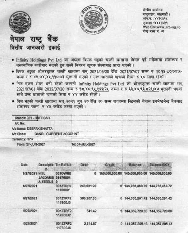 स्रोतका अनुसार भट्टको इन्फिनिटी होल्डिङ प्रालिको चुक्ता पुँजी १ वर्षमा ३ करोडबाट ४८ करोड रुपियाँ पु¥याइएको, व्यक्तिगत खातामा जगदम्बा स्टिल्सबाट ४५ करोड जम्मा भएको, समूहले हिमालयन बैंकबाट लिएको ऋण दुरुपयोग गरेको, कर छली र सम्पत्ति शुद्धीकरण ऐन उल्लंघन गरेको आरोप छ । भट्टले बैंकिङ कागजातमा नक्कली लिखत तयार पारेको अनुसन्धानमा खुले पनि राष्ट्र बैंकले हालसम्म कारबाहीका लागि प्रहरी वा अन्य निकायमा फाइल नपठाएको स्रोतको दाबी छ ।