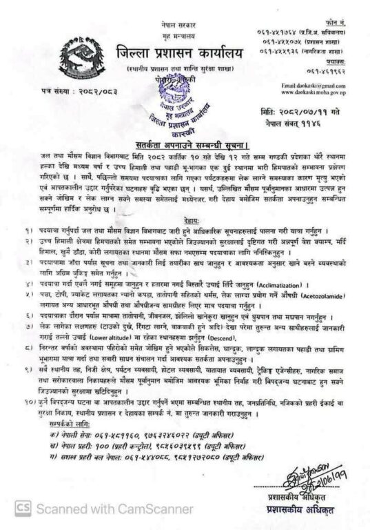 कास्की जिल्ला प्रशासन कार्यालयले जिल्लाभित्र हिउँडे मौसम नजिकिँदै गएपछि सावधानी अपनाउन आग्रह गरेको छ। जल तथा मौसम विज्ञान विभागको सूचना अनुसार कात्तिक १० देखि १२ गतेसम्म गण्डकी प्रदेशका उच्च स्थानमा हिमपात हुने सम्भावना रहेकाले यात्रु, पर्यटक र स्थानीयलाई सचेत रहन अनुरोध गरिएको हो।