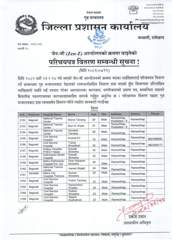 जेन जी आम्दोलनका घाइतेलाई रामेछाप प्रशासनले परिचय पत्र बितरण गर्ने भएको छ । जिल्ला प्रशासन कार्यालय रामेछापले मंगलबार सूचना जारि गदैँ आम्दोलनका घाइतेहरुलाई वडाको सिफारिस सहित सम्पर्कमा आउन भनेको छ । प्रशासकिय अधिकृत प्रकाश प्रधानले हस्ताक्षर गरेको सूचनामा घाइतेहरूको नामावली सार्वजनिक गरिएको छ ।
