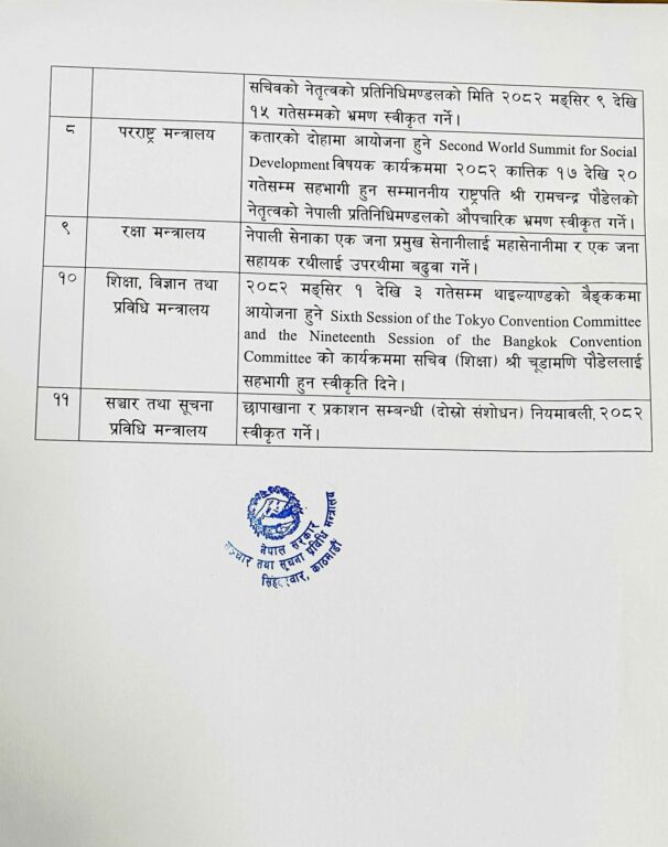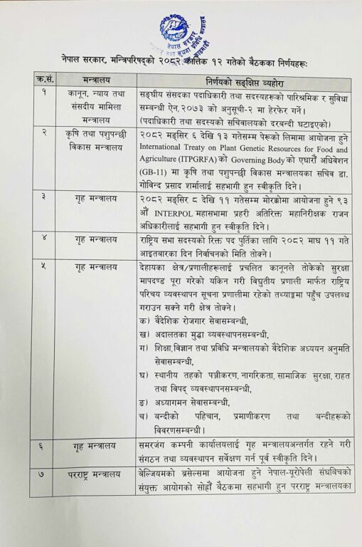 सरकारले मन्त्रिपरिषद् बैठकले पछिल्लो पटक गरेका निर्णयहरू सार्वजनिक गरेको छ । सरकारका प्रवक्ता एवम् सञ्चार तथा सूचना प्रविधिमन्त्री जगदीश खरेलले बुधबार बसेको मन्त्रिपरिषद् बैठकका निर्णय बिहीबार मन्त्रालयमा आयोजित पत्रकार सम्मेलनमार्फत् सार्वजनिक गरेका हुन् ।