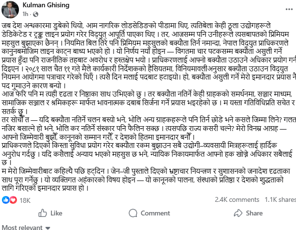 घिसिङले सबै उद्योगी व्यवसायीलाई प्राधिकरणले दिएको किस्ता सुविधा प्रयोग गरी बक्यौता बुझाउन अनुरोध गर्दै आफ्नो निर्णय व्यक्तिगत अहङ्कारको नभई कानुनको पालना र देशको हितका लागि गरिएको इमानदार प्रयास भएको बताए।