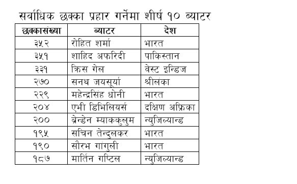 वानडे क्रिकेटमा सर्वाधिक छक्का प्रहार गर्ने सूचीमा भारतीय ब्याटर रोहित शर्मा नम्बर एक भएका छन् । दक्षिण अफ्रिकाविरुद्धको वानडे सिरिजको पहिलो खेलमा तीन छक्का प्रहार गरेलगतै रोहित नम्बर एकमा उक्लिएका हुन् । यसअघि पाकिस्तानका पूर्व ब्याटर शाहिद अफरिदी यस सूचीमा नम्बर एकमा थिए ।