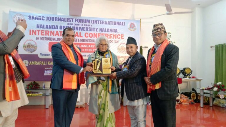 बिहारमा भएको चौथो अन्तर्राष्ट्रिय सम्मेलन रहेको सार्क जर्नलिस्ट फोरम बिहारका अध्यक्ष तथा मानवअधिकार टुडेका सम्पादक शशि भूषण कुमारले बताउनुभयो।सो सम्मेलनमा नेपालका तर्फबाट सहभागी हुने पत्रकारहरुलाई अन्तर्राष्ट्रिय मातृभाषा पत्रकारिता अवार्ड प्रदान गरिएको थियो। अवार्ड पाउने पत्रकारहरुमा नृपेन्द्रलाल श्रेष्ठ, राजु नापित, सदाब मलिक, दिपेन्द्र प्रजापति,अभिलाष गुप्ता,शैलेश गुप्ता,राजन कुमार सिंह र सुभास राम रहनुभएको छ । सम्मेलनपछि नालन्दा विश्वविद्यालयका ऐतिहासिक भग्नावशेषहरूको अवलोकन तथा भ्रमण गराइएको थियो।यस क्रममा नालन्दाको ऐतिहासिक महत्व, शैक्षिक परम्परा र प्राचीन वैभवबारे जानकारी गराइएको थियो।