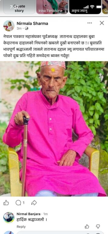 नेपाल पत्रकार महासंघका अध्यक्ष निर्मला शर्माले महासंघका पूर्वअध्यक्ष तारानाथ दाहालका पिता केदारनाथ दाहालको निधनको खबरले दुखित बनाएको बताएकी छन्।