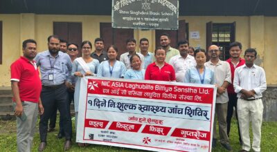 काठमाडौँएनआइसीएशिया लघुवित्तले विभिन्न स्थानमा एक दिने निशुल्क स्वास्थ्यशिविर सञ्चालन गरेको छ । एन्जल फाउन्डेसनको प्राविधिक
