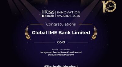 काठमाडौँग्लोबल आइएमई बैंक लिमिटेड इन्फोसिस फिनाकल इनोभेसन अवार्ड २०२५ मा प्रोडक्ट इनोभेसन विधा अन्तर्गत गोल्ड