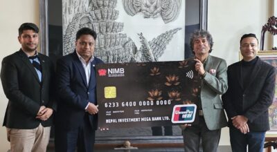 काठमाडौँनेपाल इन्भेष्टमेण्ट मेगा बैंक लिमिटेडले आफ्ना ग्राहकवर्गका लागि एनआईएमबी युनियन–पे कार्ड सेवा ल्याएको छ ।