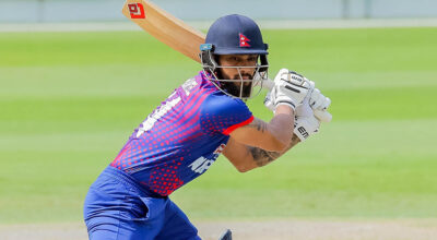 काठमाडौं । कुशल भुर्तेलले अमेरिकाविरुद्ध अर्धशतक बनाएका छन्। तेस्रो नम्बरमा ब्याटिङ गर्दै भुर्तेलले ३३ बलमा