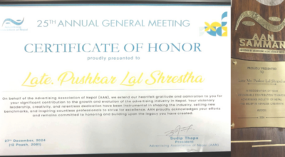 काठमाडौं । नेपाल विज्ञापन संघ (आन) ले आफ्नो २५औं वार्षिक साधारणसभामा कामना न्युज पब्लिकेसन्स् प्रालिका