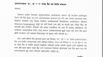 काठमाडौं । नेपाल राष्ट्र बैंकले आसन्न आमनिर्वाचनका क्रममा राजनीतिक दल, उम्मेदवार तथा स्वतन्त्र उम्मेदवारलाई चुनावी