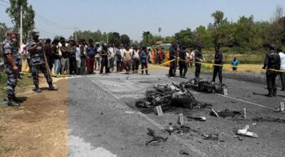 महोत्तरी . जलेश्वर बर्दिबास सडकखण्डको बथनाहा गाउँमा आज बिहान दुई वटा मोटरसाइकल एकापसमा ठोक्किएर आगलागी