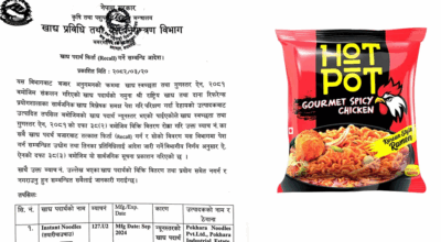 काठमाडौं। गुणस्तर परीक्षणमा फेल भएपछि खाद्य प्रविधि तथा गुण नियन्त्रण विभागले पोखरा नुडल्स प्रा.लि.द्वारा उत्पादित