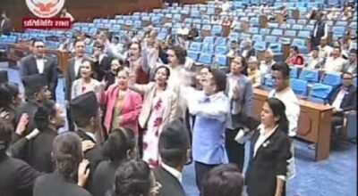 काठमाडौं । प्रतिनिधिसभाको बैठकमा राष्ट्रिय स्वतन्त्र पार्टीले रोष्ट्रममा पुगेर नाराबाजी गरिरहेका छन् । नेकपा एमाले