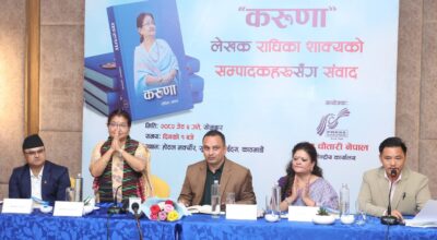 काठमाडौं। प्रधानमन्त्री पत्नी राधिका शाक्यको आत्मकथा ‘करुणा’का विषयमा आज विभिन्न सञ्चार माध्यमका सम्पादकहरुसँग संवाद भएको