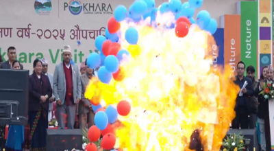 पोखरा । पोखरा भ्रमण वर्ष २०२५ उद्घाटन समारोहमा पड्किएको बलुनमा ग्यास भर्ने एक भारतीय नागरिक