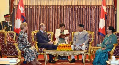 काठमाडौं । बेलायती राजकुमार एडवार्ड र उनकी धर्मपत्नी सोफियाले राष्ट्रपति रामचन्द्र पौडेलसँग भेटवार्ता गरेका छन्।