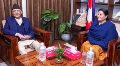 काठमाडौं । प्रधानमन्त्री केपी शर्मा ओली र पूर्व राष्ट्रपति विद्यादेवी भण्डारीबीच आज भेटघाट भएको छ