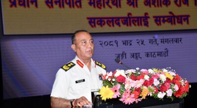 काठमाडौं । प्रधान सेनापति महारथी अशोकराज सिग्देलले जङ्गी अड्डास्थित सभामण्डपमा सकलदर्जालाई पहिलो पटक सम्बोधन गरेका