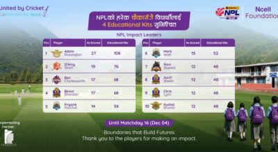 एनसेल फाउन्डेसनले एनपीएल खेलका चौका बापत २ हजार बढी शैक्षिक सामग्री वितरण गर्ने