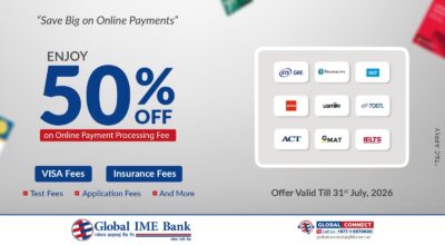 ग्लोबल आइएमई बैंकबाट अन्तर्राष्ट्रिय अनलाइन भुक्तानी ५० प्रतिशत छुट