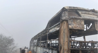 कपिलवस्तुमा गुडिरहेको यात्रुबाहक बसमा आगलागी, बस पूर्ण रूपमा जलेर नष्ट