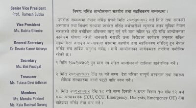 नेपाल नर्सिङ संघद्वारा न्युनतम तलब सुविधा कार्यान्वयनको माग गर्दै आन्दोलन घोषणा