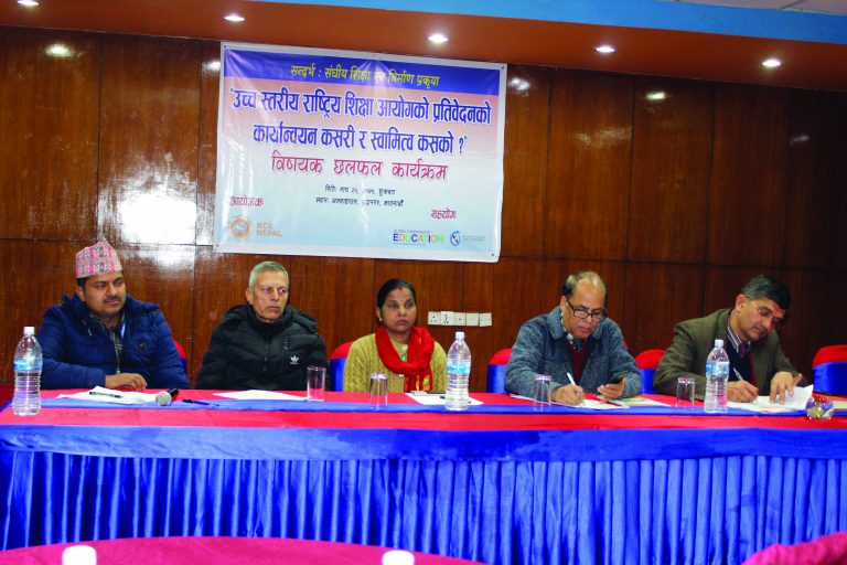 उता शिक्षाका लागि राष्ट्रिय अभियान (एनसीई) नेपालले उच्चस्तरीय राष्ट्रिय शिक्षा आयोग प्रतिवेदनको कार्यान्वयन कसरी र स्वामित्व कसको भन्ने विषयमा छलफल कार्यक्रम गरेको छ। आयोगको प्रतिवेदन हस्तान्तरण भइसकेको र संघीय शिक्षा ऐन निर्माणका क्रममा रहेको सन्दर्भमा उक्त ऐनले प्रतिवेदनमा परेका सुझावलाई कसरी समेट्न सक्छ, प्रतिवेदन कसरी कार्यान्वयनमा लैजान सकिन्छ र त्यसको अपनत्व वा स्वामित्व कसको हो भन्ने सवालमा सरोकारवालाबीच