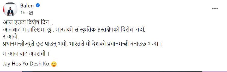 सर्वोच्च अदालतले दिएको तारेखपत्र सामाजिक सञ्जालमार्फत सार्वजनिक गर्दै मेयर बालेन्द्रले भारतको सांस्कृतिक हस्तक्षेपको विरोध गर्दा आफू ‘अपराधी’ हुन पुगेको उल्लेख गर्दै भारतले प्रधानमन्त्री बनाउँछ भन्दा प्रधानमन्त्री (प्रचण्ड) ले छुट पाएको उल्लेख गरेका छन् ।
